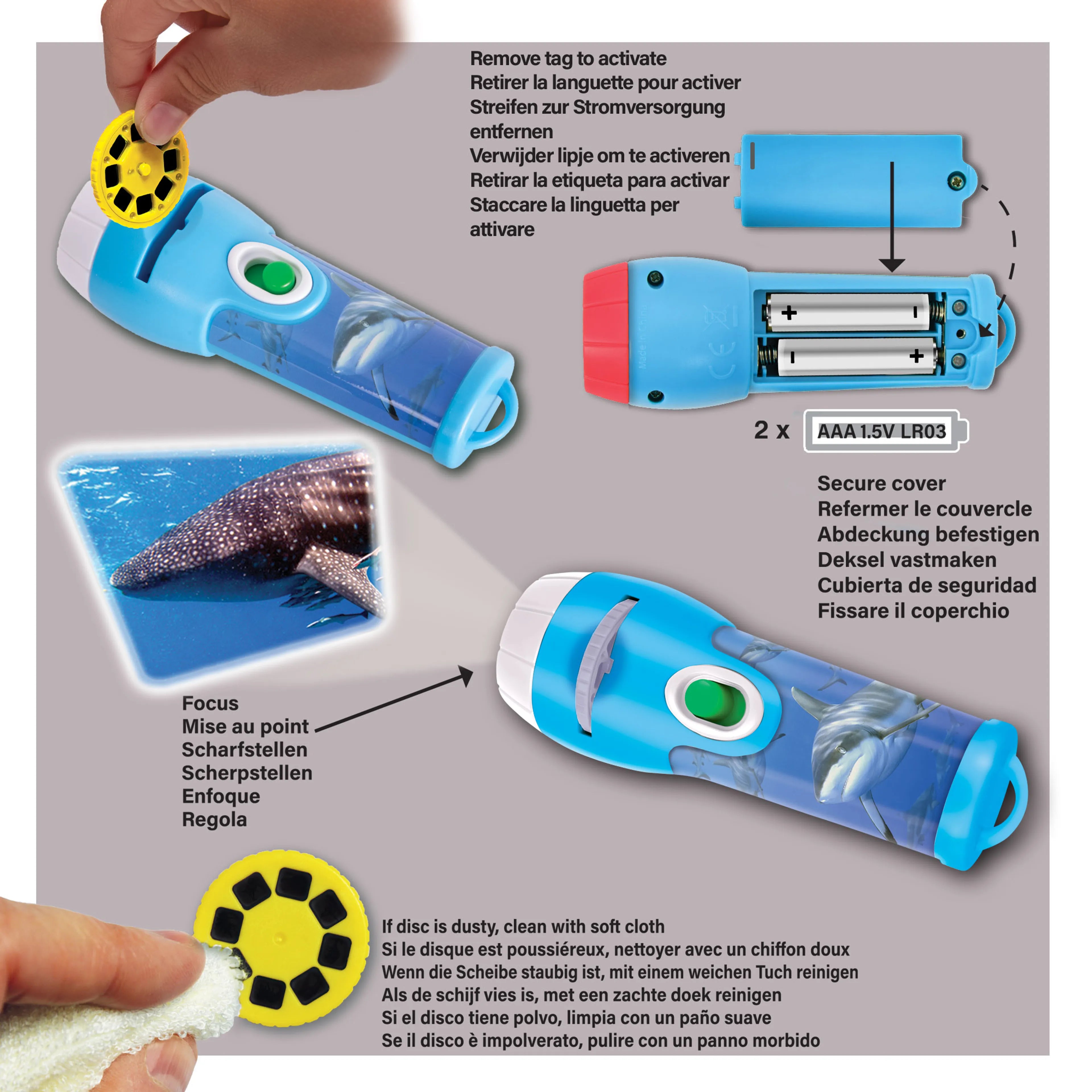 The torch is supplied with three slide discs which include the 24 Shark photographs. Swap and change the slides in the torch easily then rotate the disc round to view the fantastic colour images which project up to one metre wide. Images are easily focused by turning the lens head. This product can be used as a normal torch without the slides in place and is great for keeping on bedside tables to give comfort to children during the night. The torch measures 12cm long and 4cm in diameter.