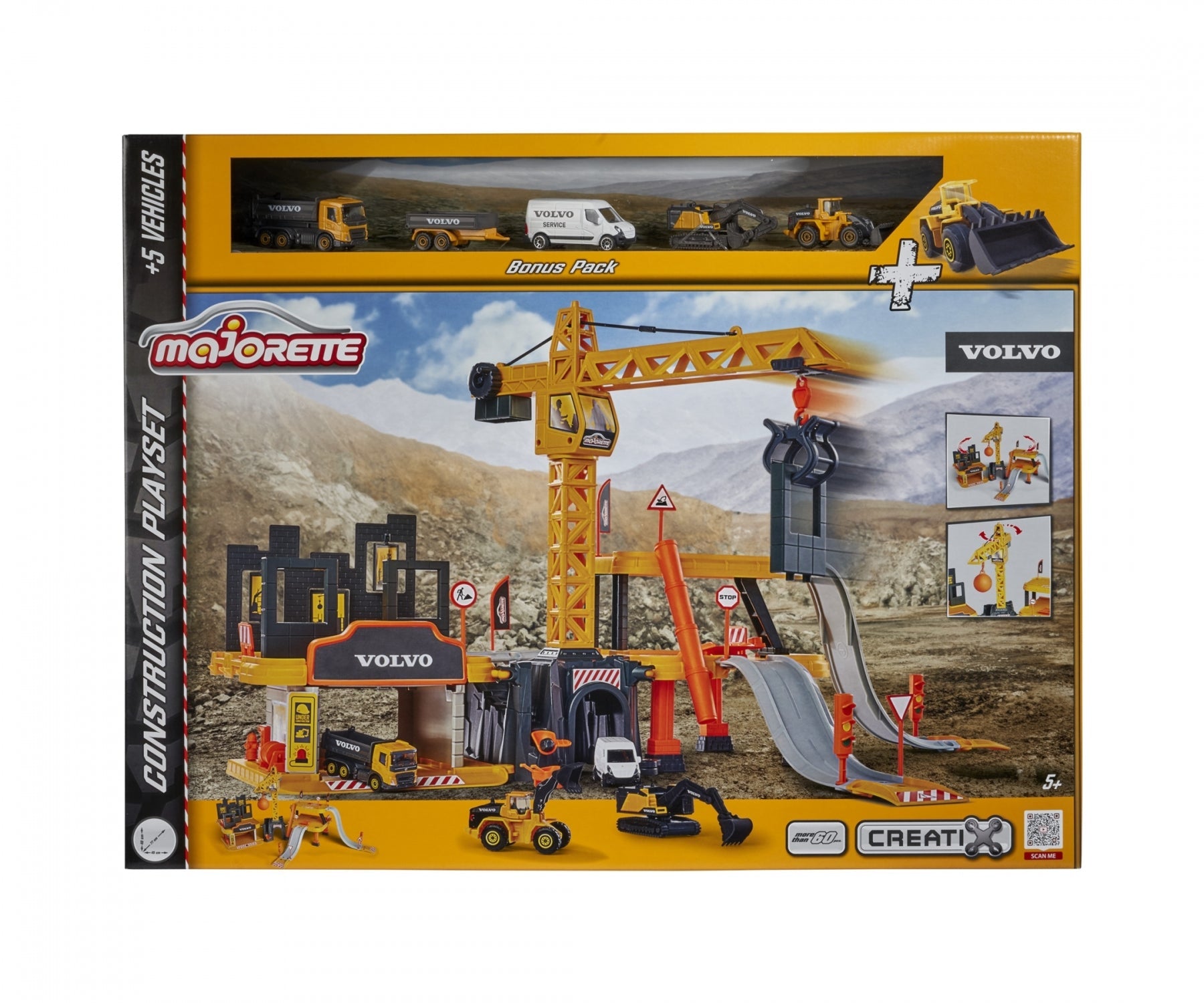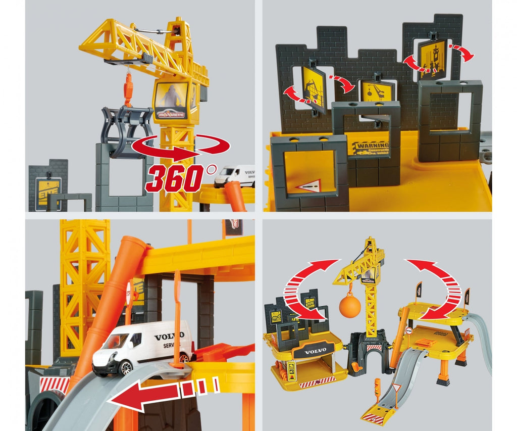 Majorette – Creatix construction site – XXL construction toy set, includes 5 Volvo construction vehicles, crane, tunnel, garage, three levels, for children aged 5 and above