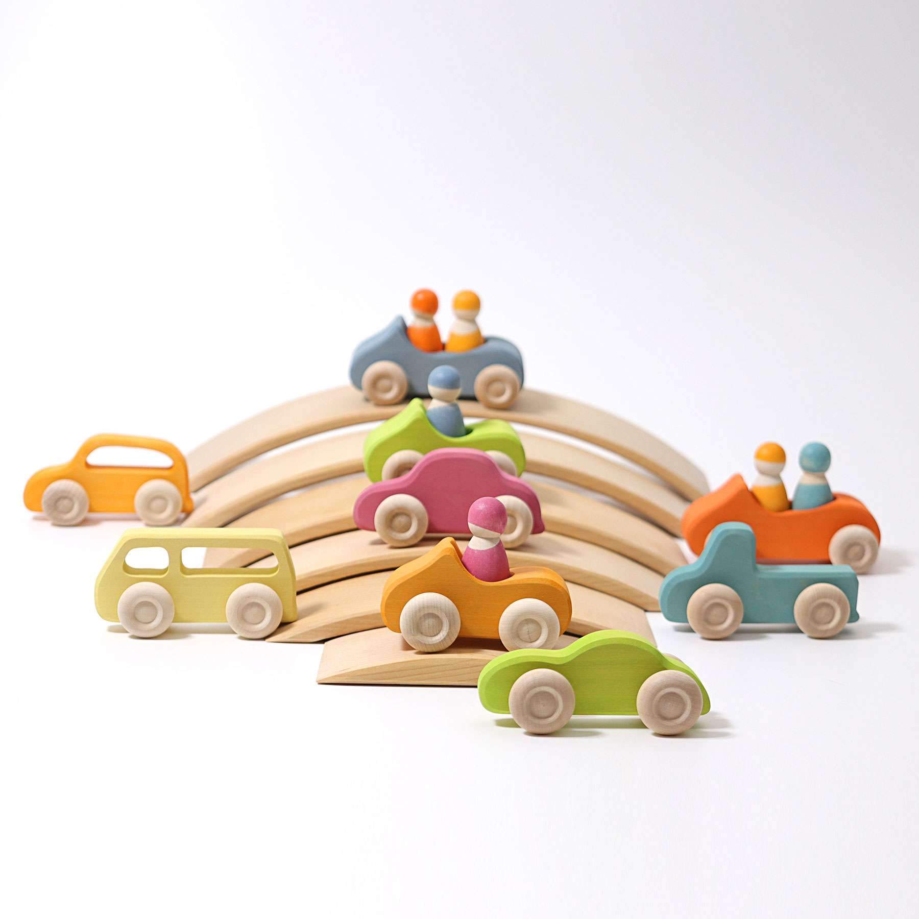 Whether the sports car, pick-up, van, bus or limousine, these slim classic wooden cars travel comfortably over narrow bridges and are perfectly sized for easy grasping by small children's hands.