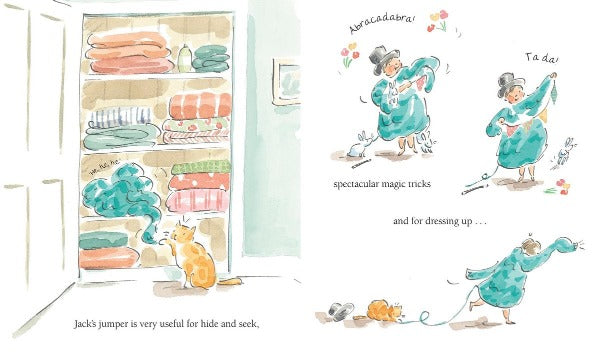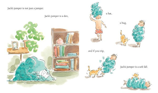 Jack’s jumper is special because it can be many things – a den, a hat, a hug – but most of all it is special because it belonged to Jack’s big brother, Paul. Jack wears the jumper every day, but when forced to take it off to have a bath, the cat sees a comfy new bed...