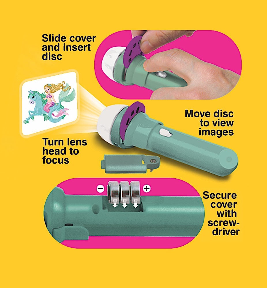 The torch comes with three slide discs with 24 colour mermaid images. Swap and change the slides easily by pulling back the plastic flap and inserting the chosen disc then rotate the disc round to view the fantastic colour images which project up to one metre wide. Images are easily focused by turning the lens head.
