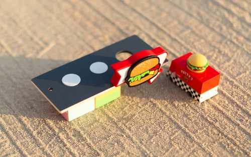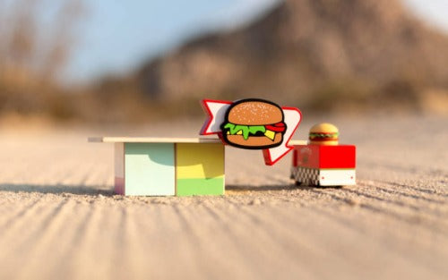 These are modular building blocks that are ready for play – you can combine signs, roofs, and multiple blocks with a clever all-wooden system. Playful carchitecture play at its best. Pairs perfectly with its matching Food Van, sold separately.