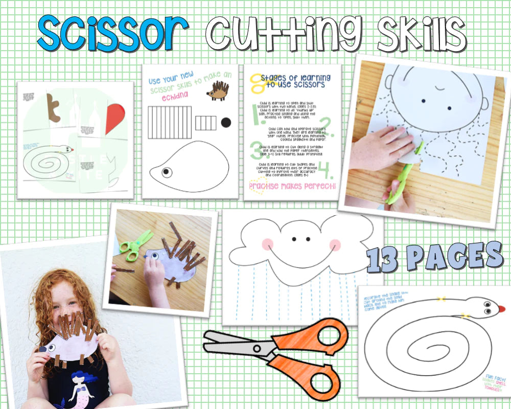 Access to FREE Scissor skills activity pack with 13 pages of fun cutting activities.