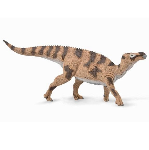 The CollectA Brighstoneus is an awesome dinosaur model from the 2023 CollectA range. This iguanodontian is modelled in a walking position, on all fours, looking ahead. It has been painted predominantly light brown with dark brown stripes, a grey underside, and features white patches around its eyes. Scaly detailing is evident across its muscular body and legs, ensuring this impressive herbivore is ready for prehistoric adventures or display in your personal dinosaur museum.