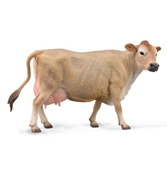 The CollectA Jersey Cow model is sculpted in a walking position and is painted almost entirely light brown with a cream underside, pink udders and black eyes and muzzle. This sweet cow is ready for a country adventure on your make believe farm.