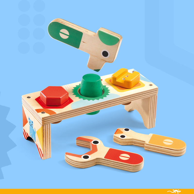 This adorable wooden toolset will keep toddlers entertained for hours. It features a colour little bench with 3 different screws in their colour coded place. It also comes with three animal-shaped tools.