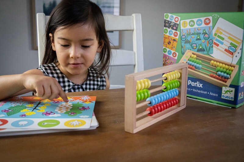 The "challenge" card indicates items to be counted in the picture; Children count and indicate the number on the abacus. To check if the number is right, flip over the card to see the solution. Handling the abacus deepens the counting process and the transcription of numbers into quantities. Very detailed instructions are available to help parents to set up the activity.