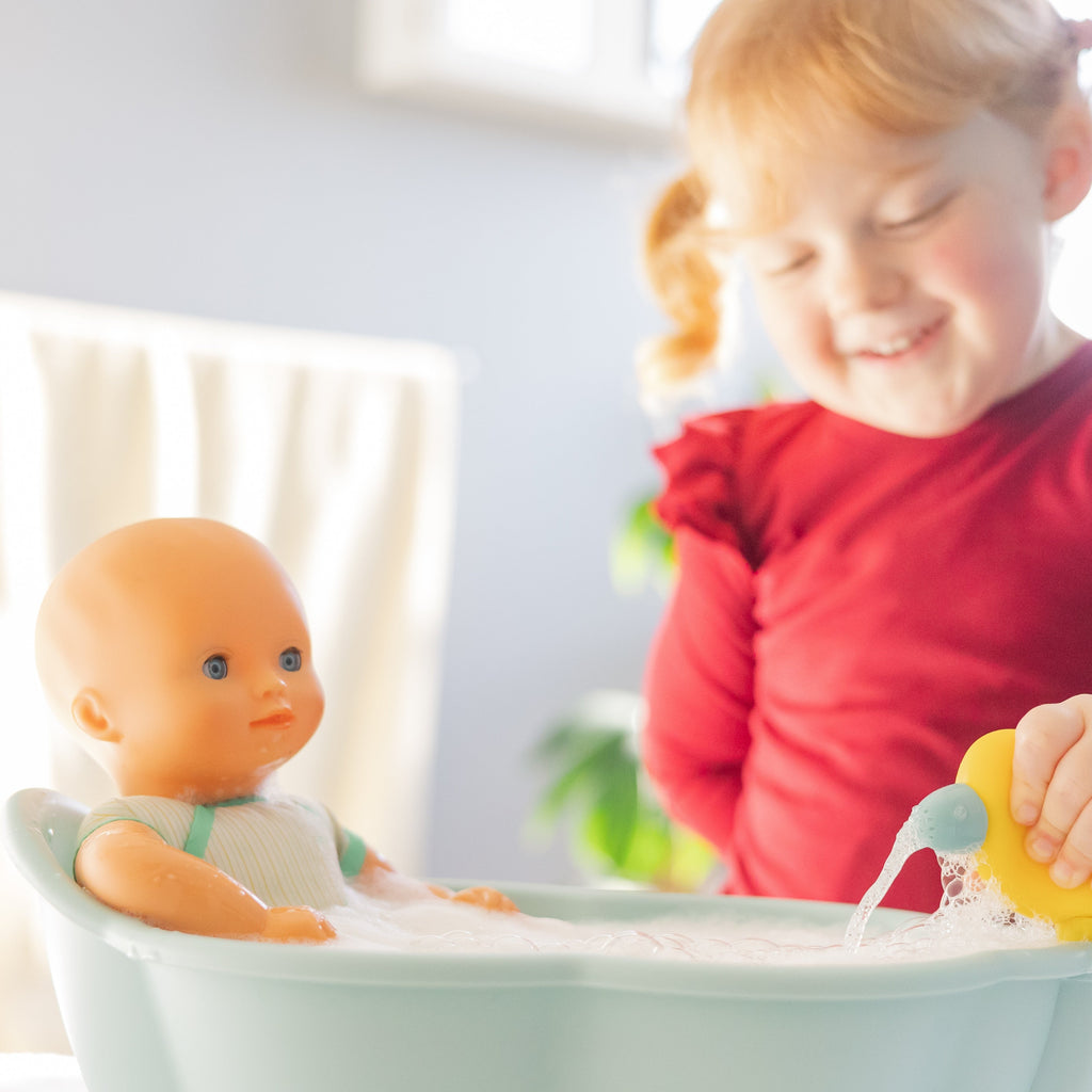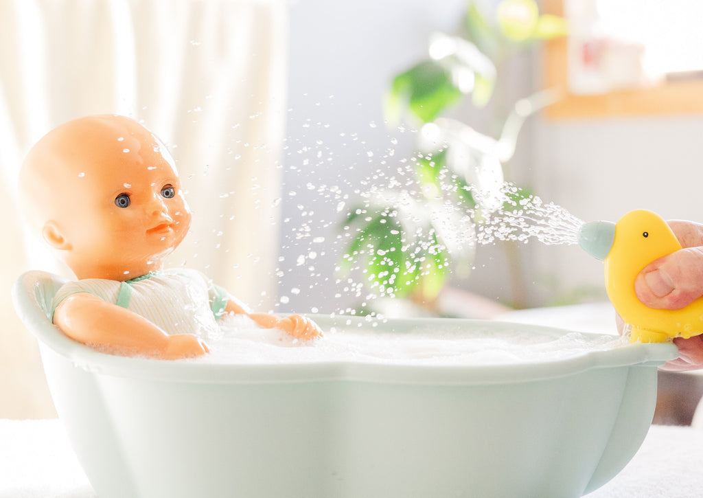 This bathtub is shell-shaped with a bird shower: perfect for spending a pleasant time with your bathing doll. The shower works like a squirt toy. Once the water is pumped, it comes out through the bird’s beak. When the bath is over, the tub is emptied and rinsed with clean water. Suitable for dolls of 30 to 36 cm. No batteries are required. Soft hand shower, suitable for small hands and opens for easy cleaning.