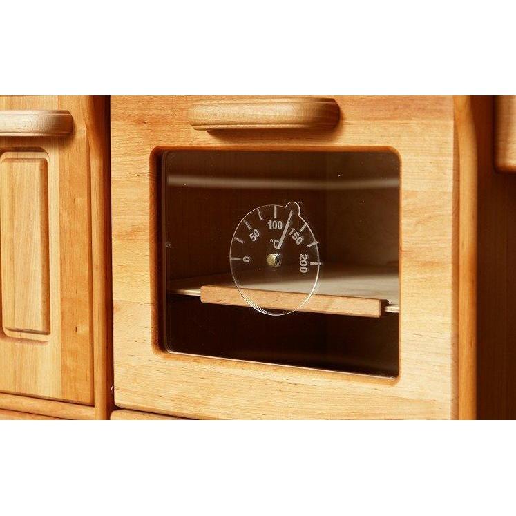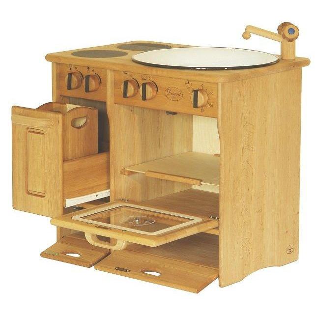 The wooden stove and sink combination comes with two hotplates, an oven with opening door and inner shelf, an enamelled basin and wooden tap, rolling dishwasher or cutlery drawer, and two bottom shelves to store your oven trays and breadboards!