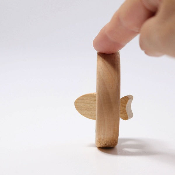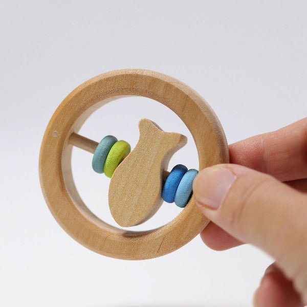 This beautiful small fish rattle with colourful wooden discs in blue and green tones is made of alder wood and finished with plant based oil.