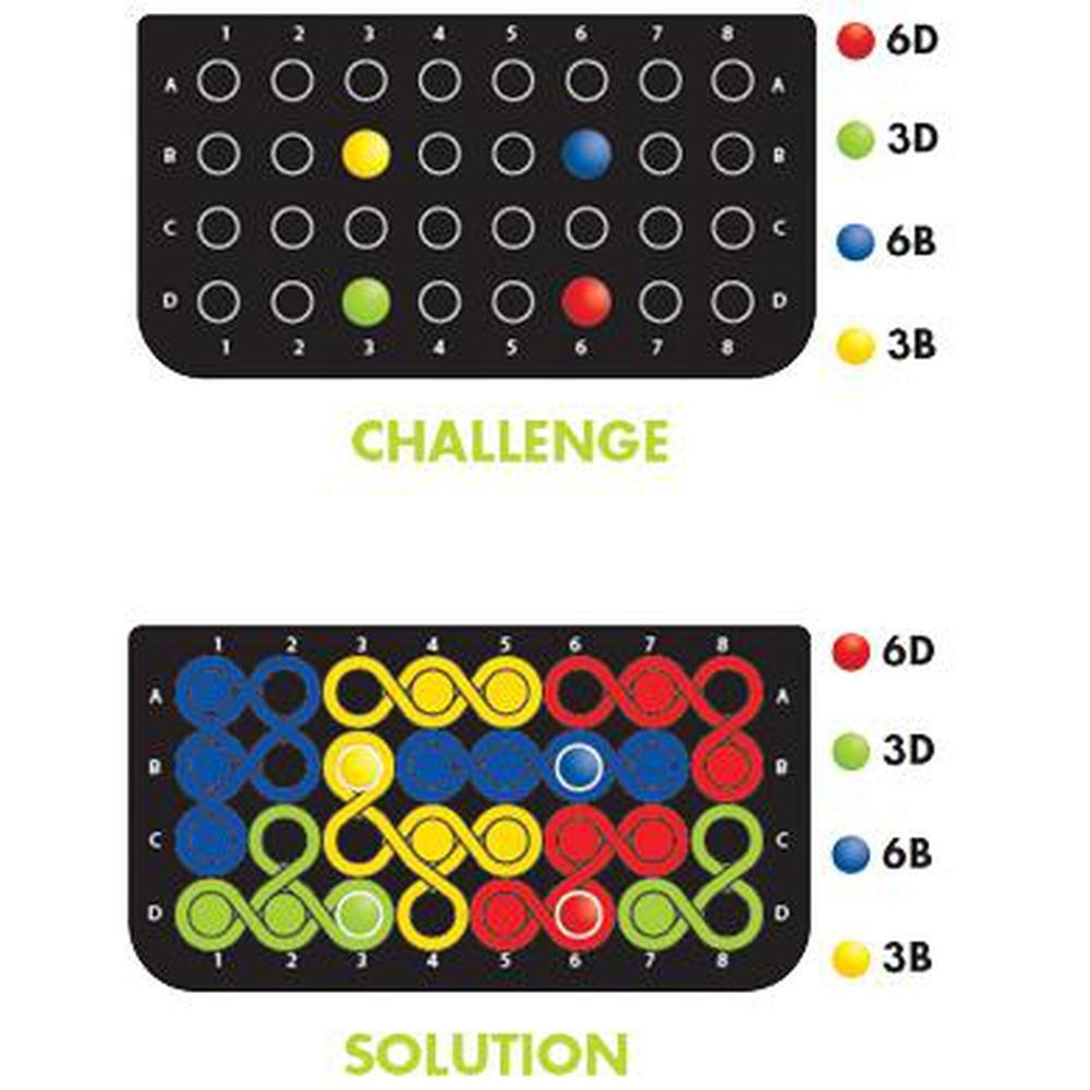 The game consists of 8 twisted puzzle pieces and 7 coloured pegs. To play, choose a challenge from the booklet. You’ll need to place the coloured pegs on the board to match the puzzle challenge. Then, your goal is to fit all the twisted puzzle pieces back into the board.