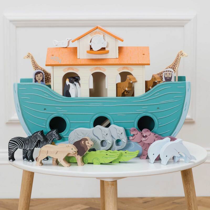 The classic toy: a big beautiful painted wooden ark with ten pairs of hand-finished painted wooden animals plus Noah and his wife.