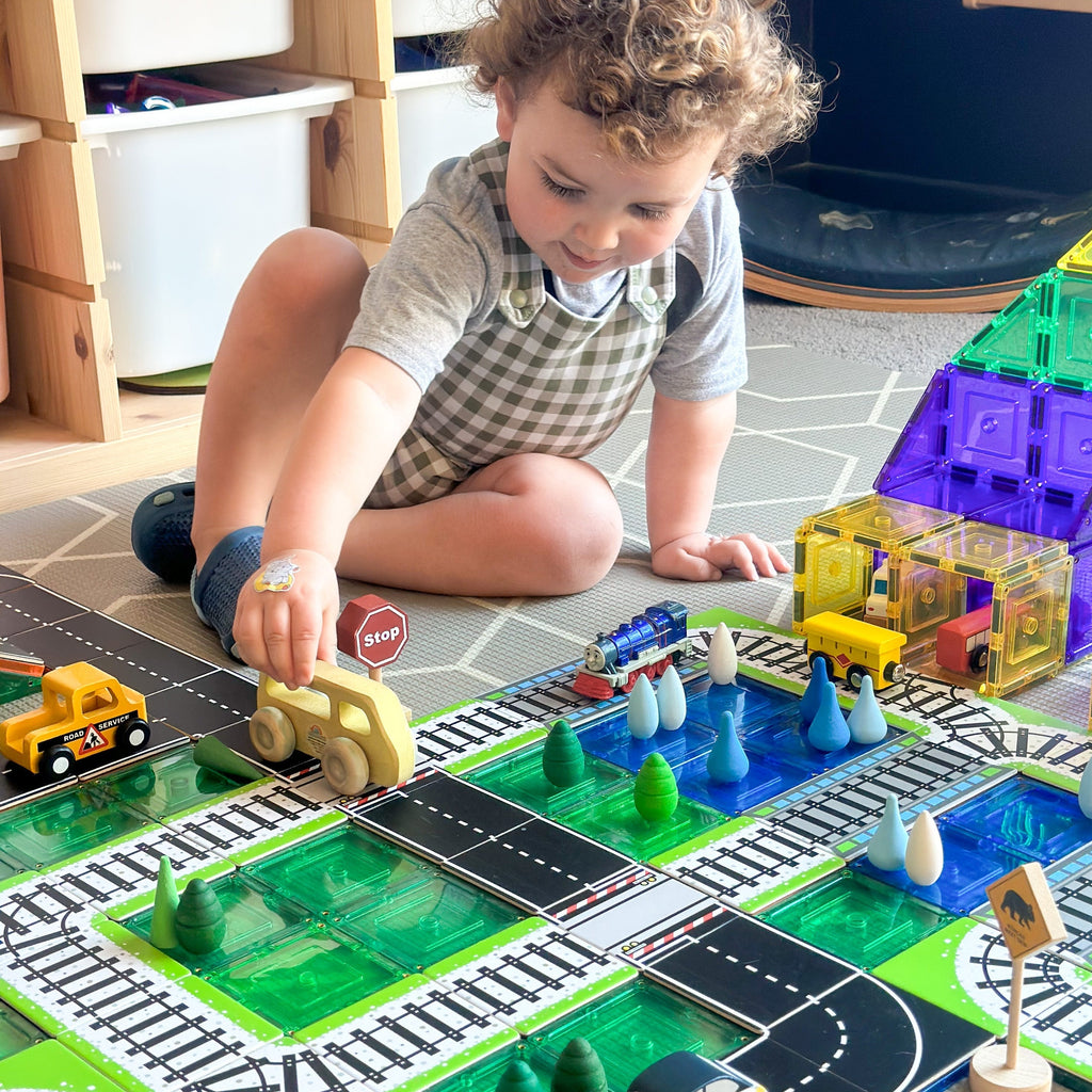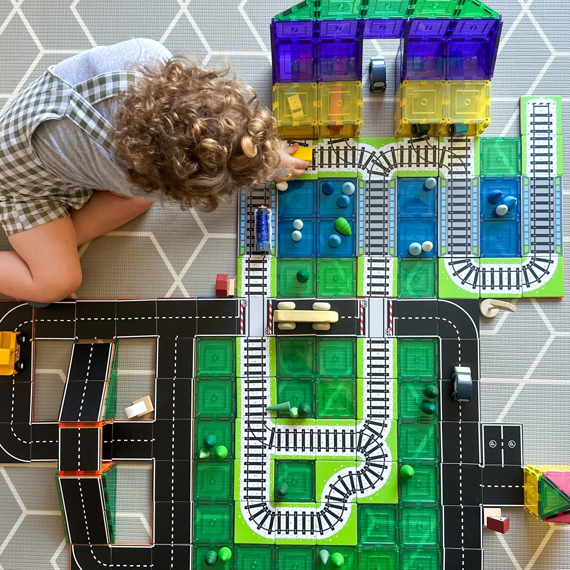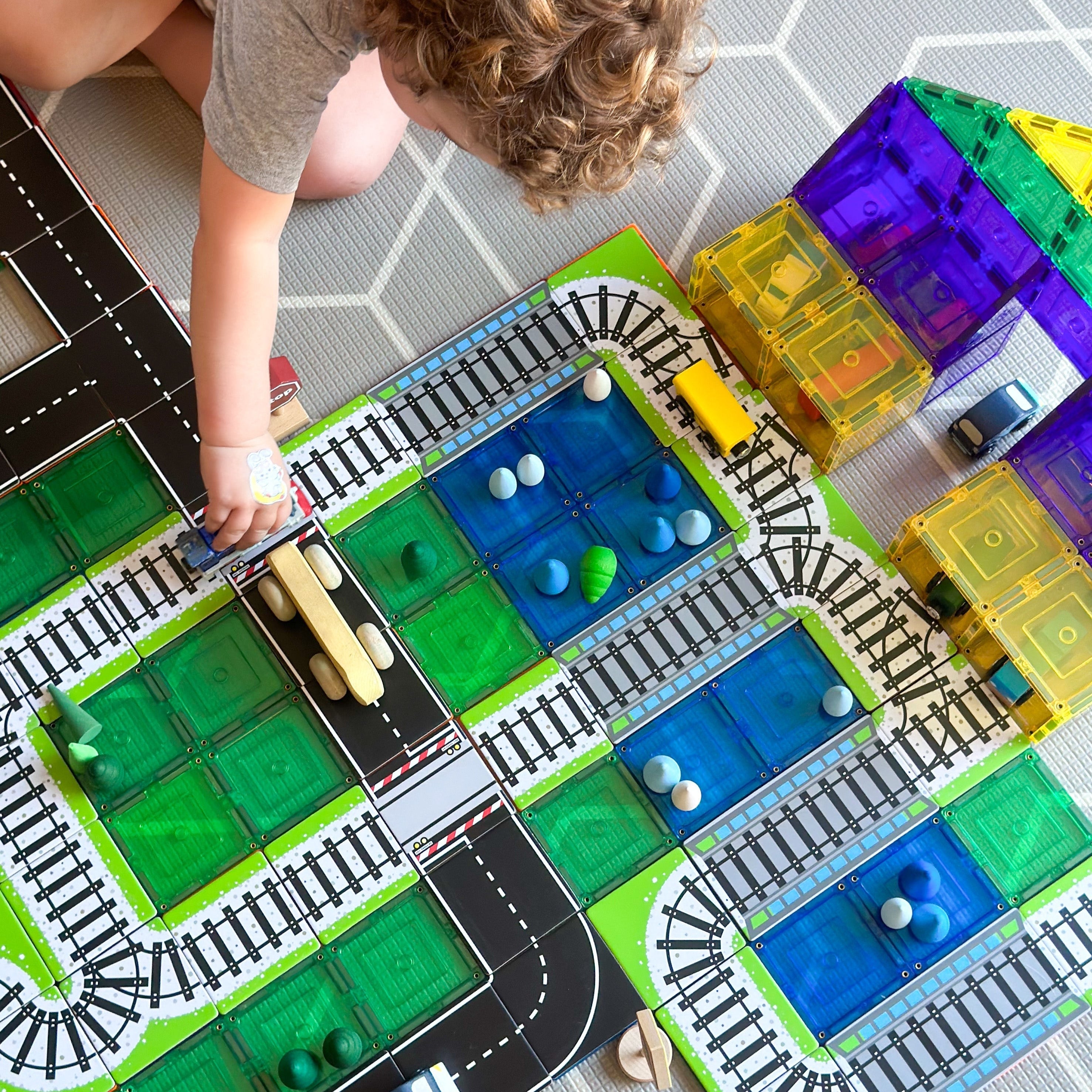 Our 36 piece pack allows you to create train tracks by adding our tile toppers to your existing magnetic tiles. We have created this train track set to work seamlessly with our road track with the use of our level crossings.