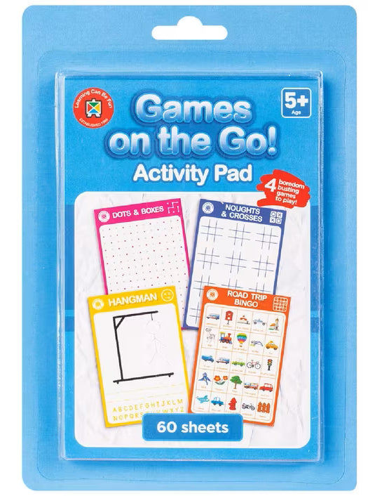 The 60-page pad features four boredom-busting games to play including dots and boxes, noughts and crosses, hangman and bingo
