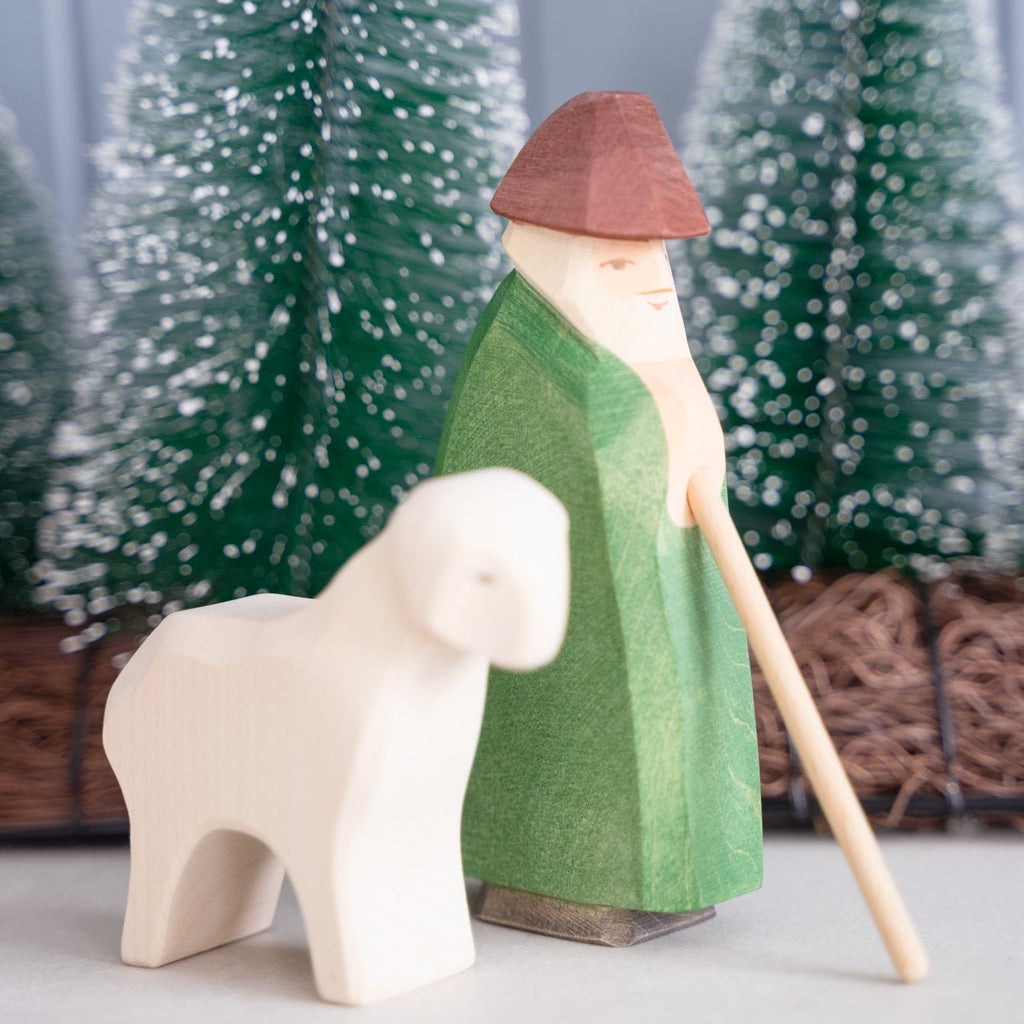 Shepherd with Staff. This figurine has been carefully handpainted to create realistic expression. Lovingly handcrafted from Maple wood. Staff is fixed/removable.