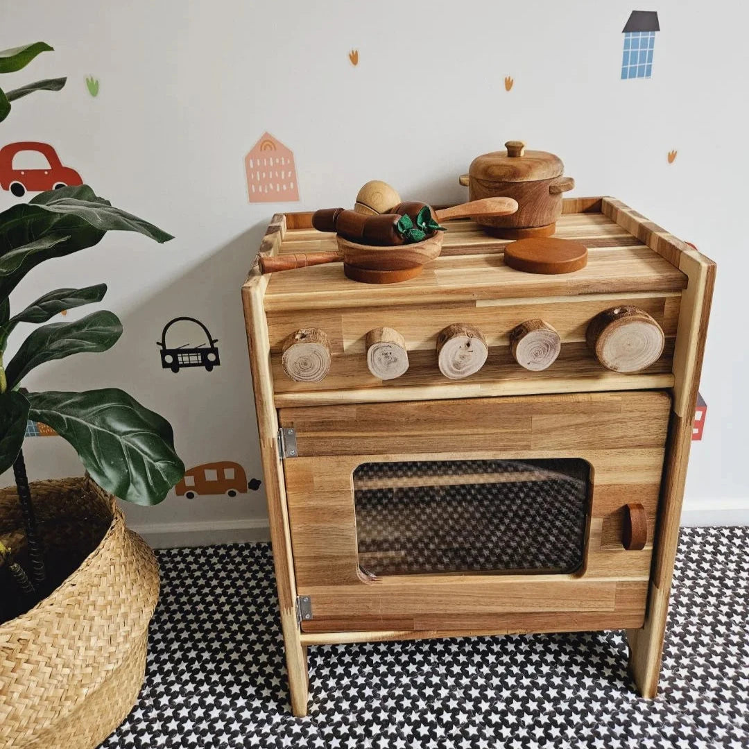 Crafted from timber and meticulously designed to mimic a real stove top, our Natural Wooden Stove prioritizes safety and simplicity. The timber is expertly sanded, smoothed, and finished with beeswax and natural oils, ensuring a child-friendly surface with rounded edges for added safety. Parents can have peace of mind knowing that their child’s playtime is both enjoyable and safe, with no harsh chemicals or rough edges to worry about.