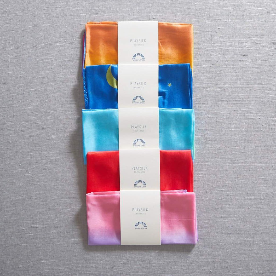 Our Enchanted Playsilk Set is a must have for all creative play. If you keep a basket of our Enchanted Silks nearby, you'll be amazed at the many ways your child finds to use them!