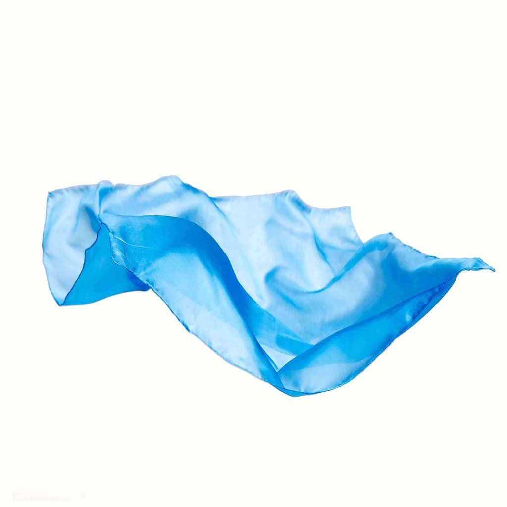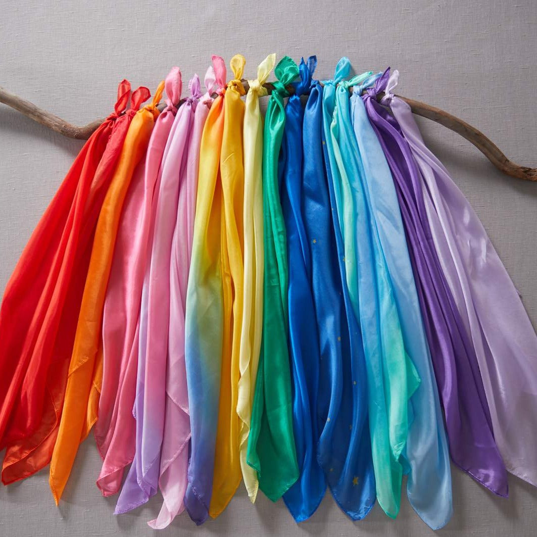 Some children make costumes like capes, skirts, pants, hats, veils, animal tails and more. The next day the same silks become green grass for their toy animals to live on, blue water to sail the boats, or a rainbow can appear in the sky above them. Many children wrap their dolls in them or tie them on as a sling to carry a favourite animal or doll around in. They can be used to build forts with the sofa cushions, for a puppet show curtain, and for magic tricks.