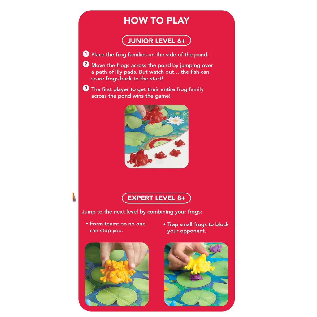 Guide your frogs across the pond and block other players from doing the same. The first player to get their entire frog family to the other side wins the game. But watch out, the fish can scare your frogs back to the start! Flexible thinking, clever planning and the chance to thwart your opponents make this a fun and exciting game for two to six players.