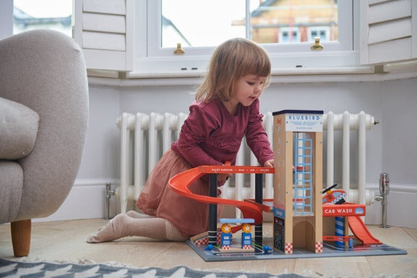 A quality and bright version of a classic garage and service station. This interactive toy includes 2 plastic ramps which adds lots of play value to this wooden playset. Features 3 wood cars, a helicopter and petrol pumps. It even has an area to wash the car or pump up the tires!