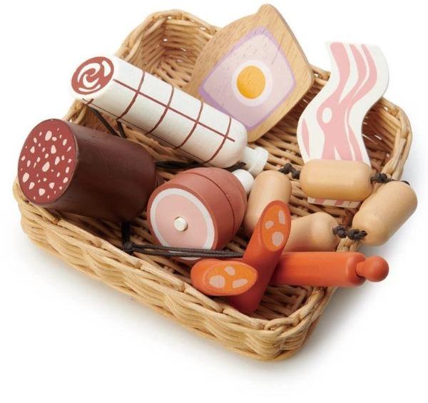 A market basket filled with wooden cured meats. The set comes with 8 wooden items.