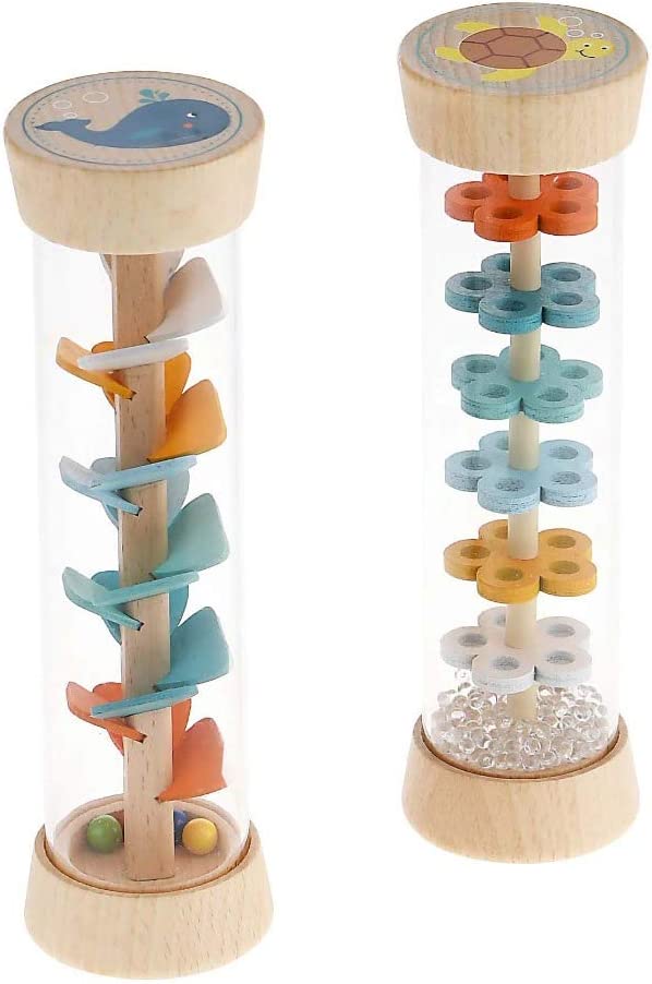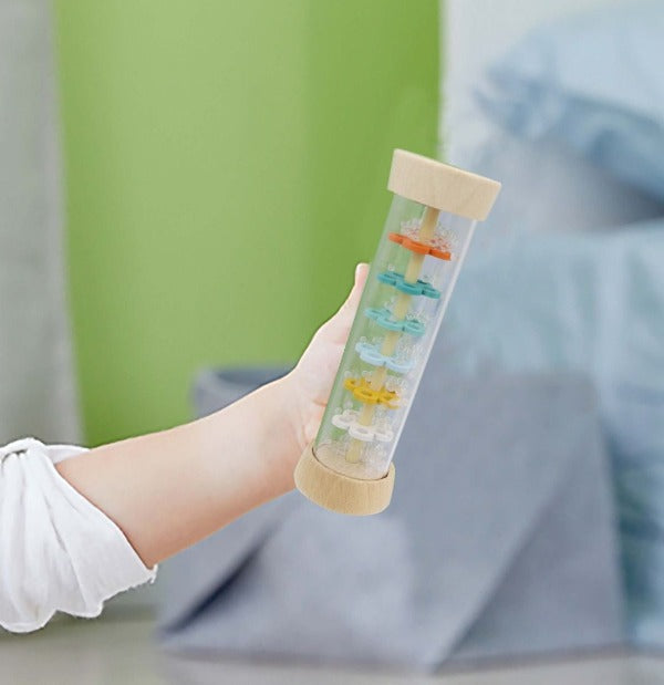 It's a rattle, it's a fun sensory toy and musical rainmaker all in one! When you turn me over, the beads fall with gravity and create a rain or waterfall sound, when you shake me I create a sharper rattling sound. There's 2 different designs a cascading waterfall or falling rain which are picked at random.