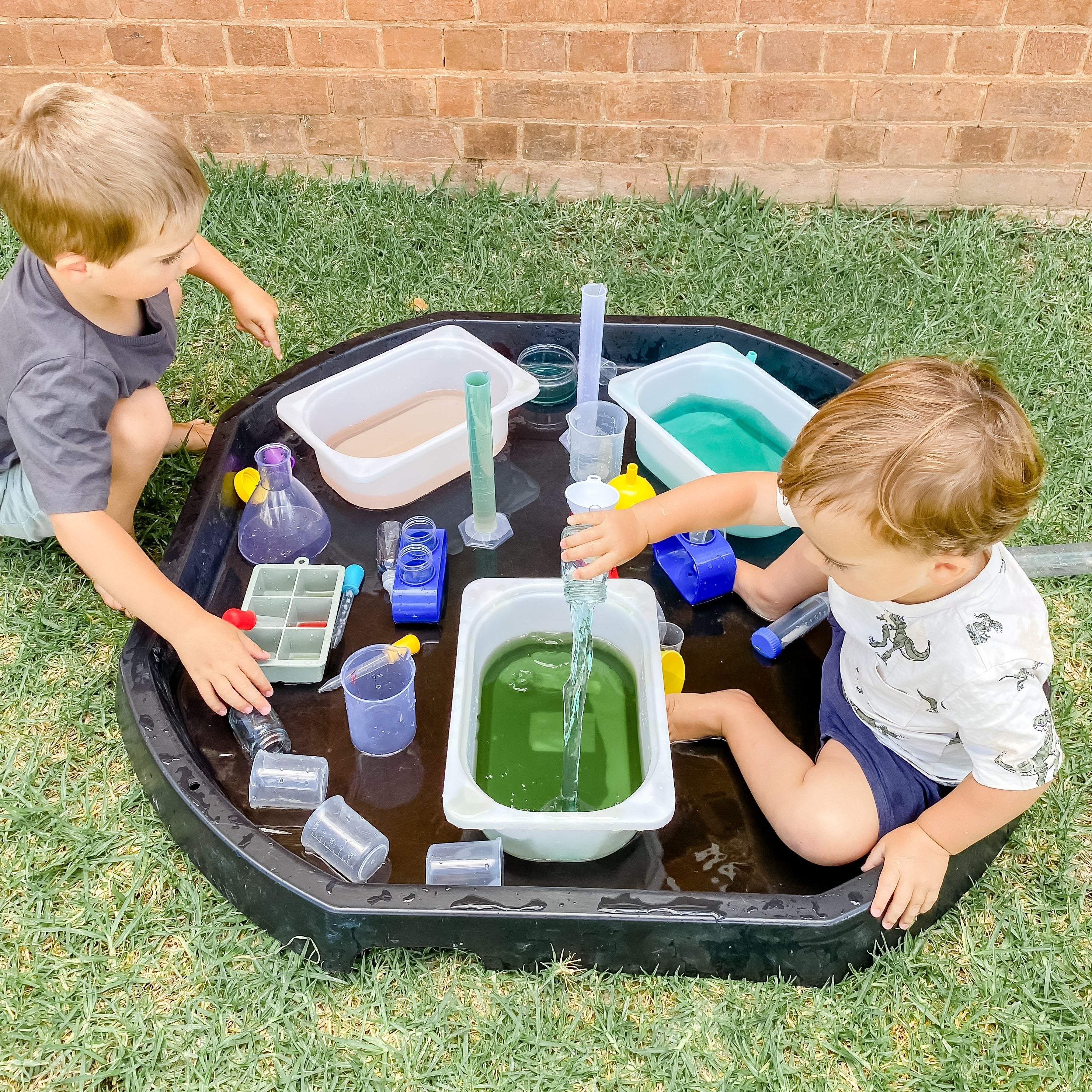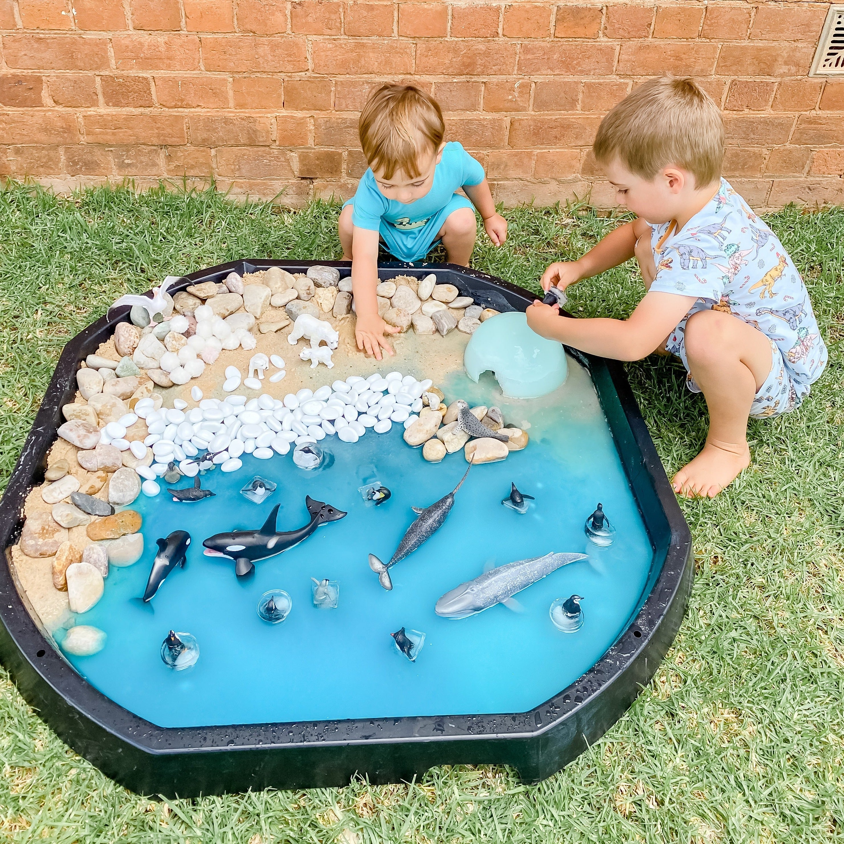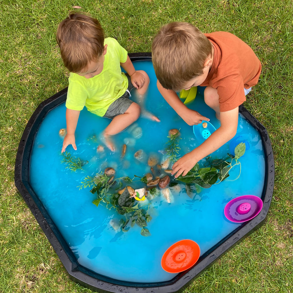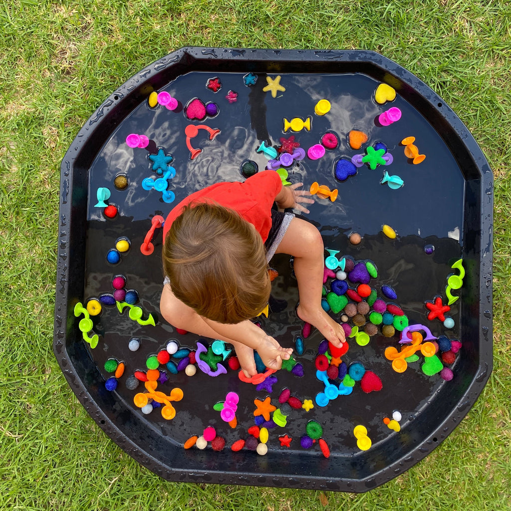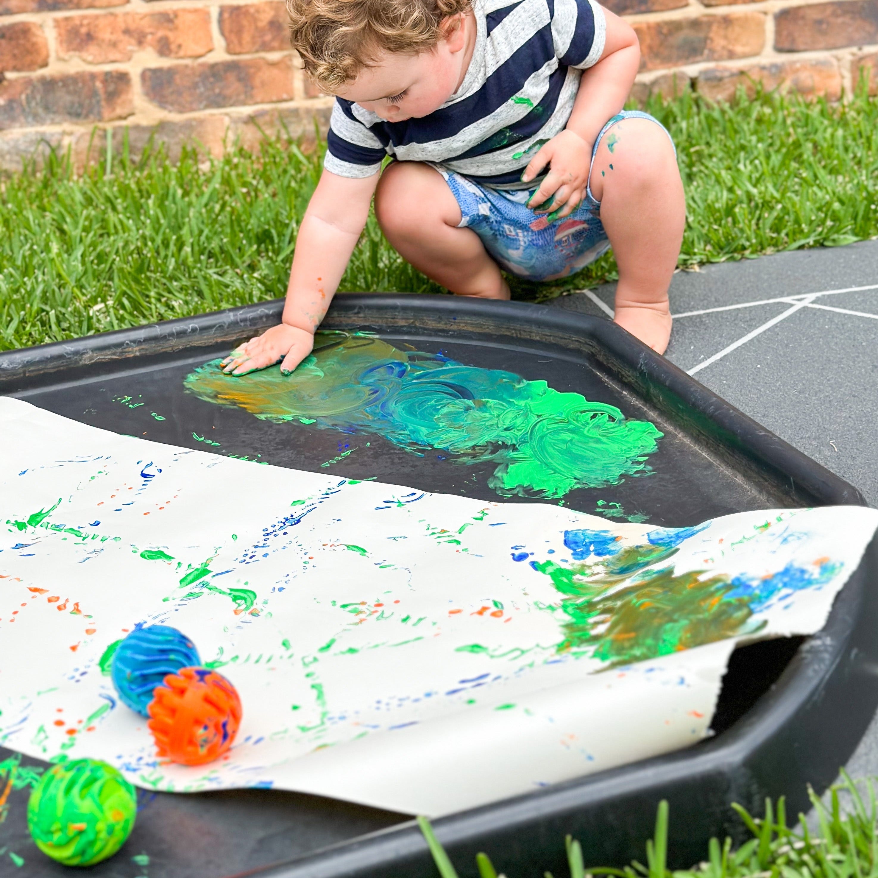 These large, shallow trays allow you to set up paints, messy play, small world play or sensory play whilst keeping any mess inside the shallow edges of the tray. The size of the tray allows multiple kids to play and it can be set up inside or outside.
