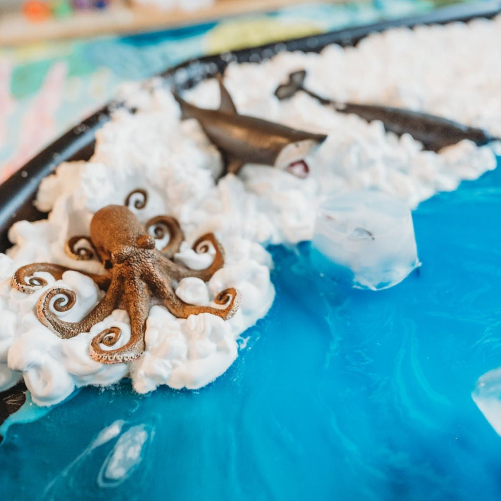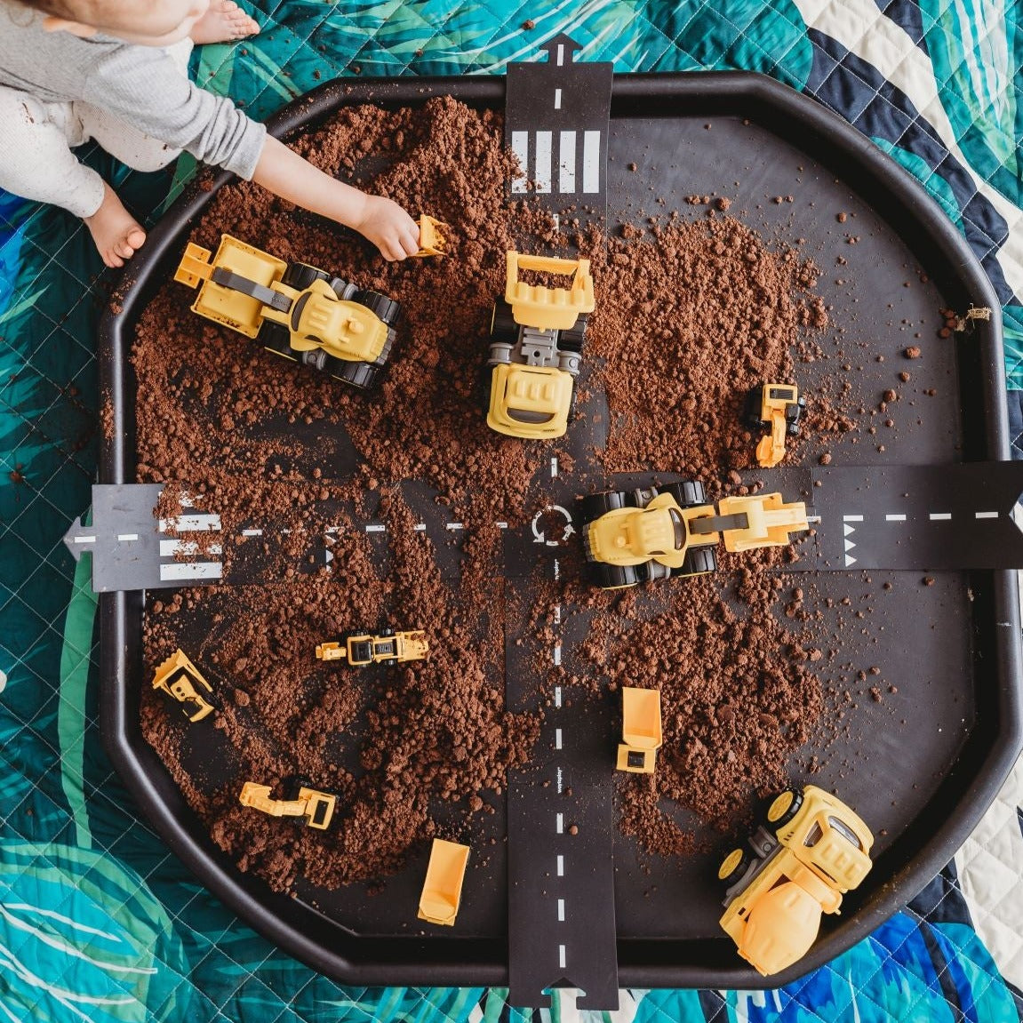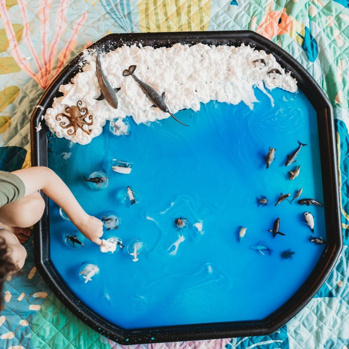 Add sensory cotton sand, water beads, CollectA animals, playdough, and more to your tray to invite your child to play and learn.