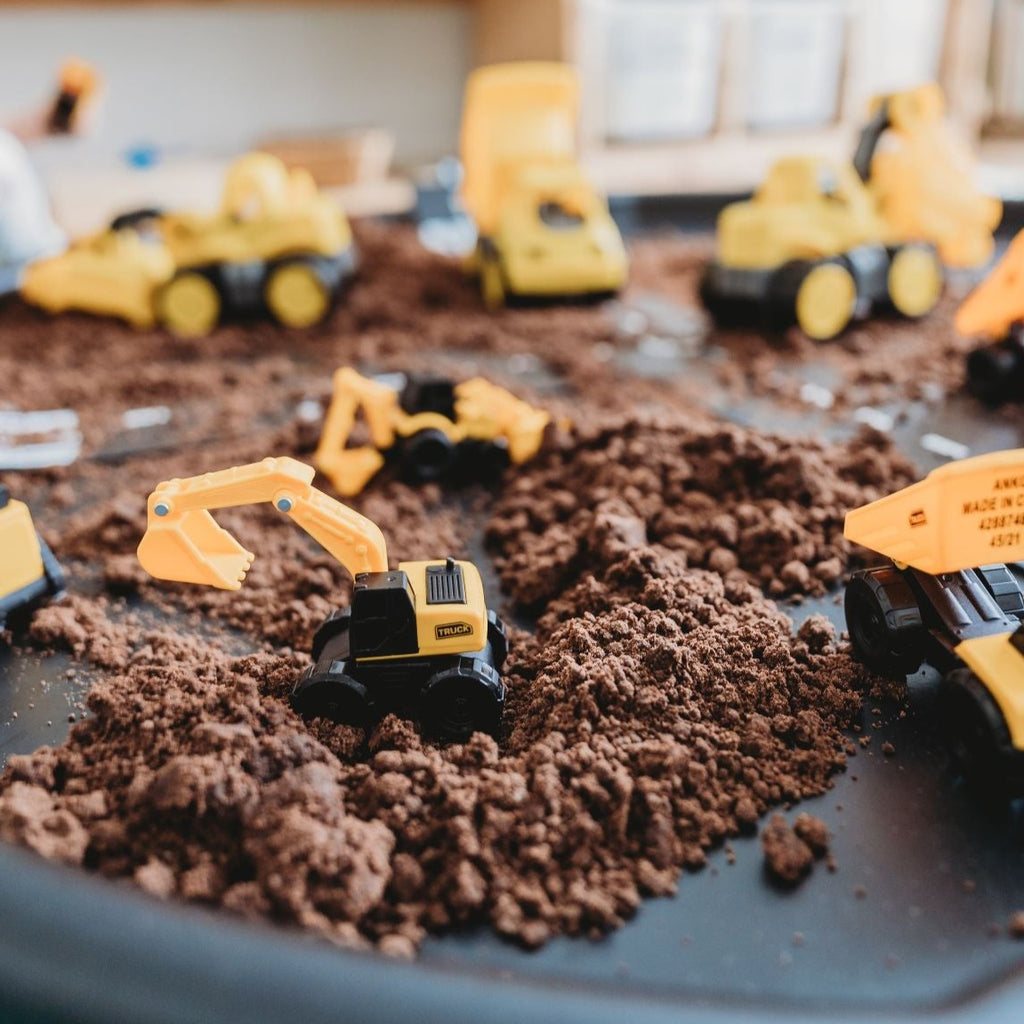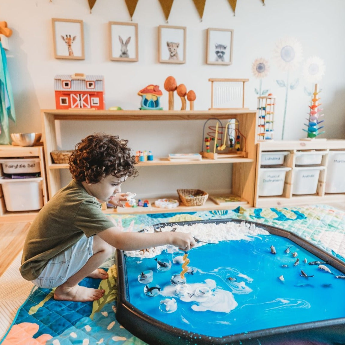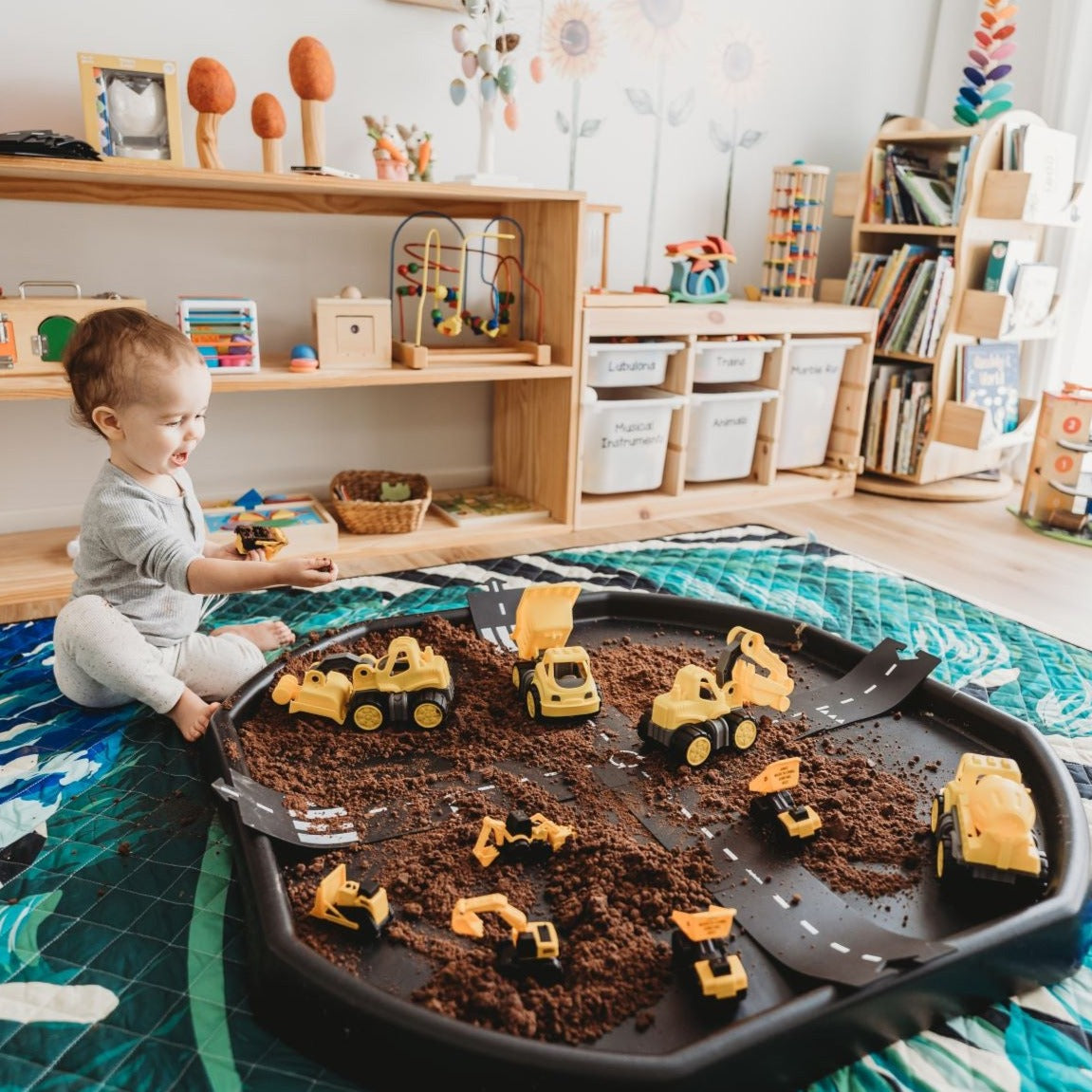 Add sensory cotton sand, water beads, CollectA animals, playdough, and more to your tray to invite your child to play and learn.